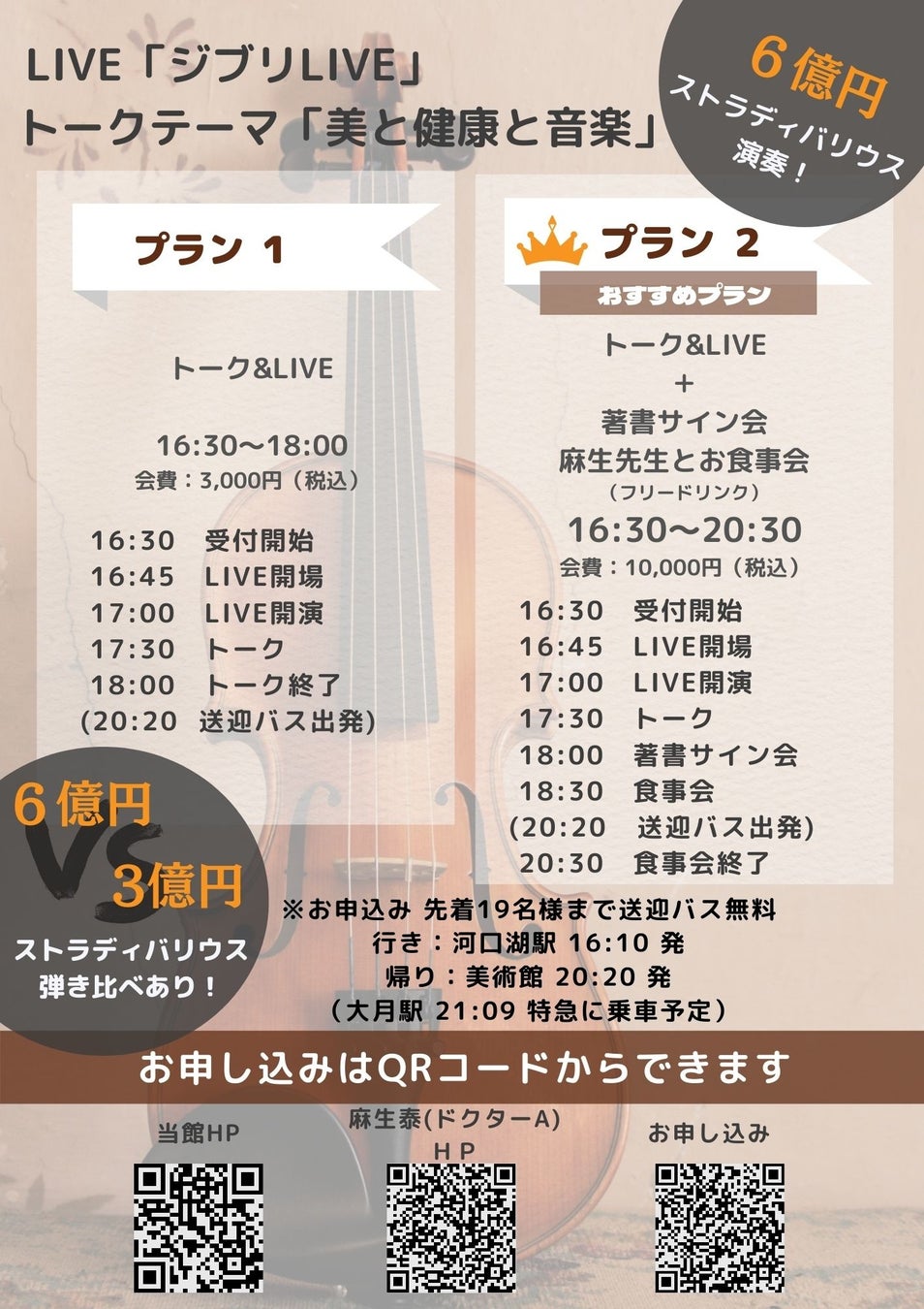 6億円と3億円のストラディヴァリウスを麻生泰が弾き比べ!?You Tubeでも人気の美容外科医による「美と健康と音楽」をテーマにトーク&Liveを開催【河口湖音楽と森の美術館】