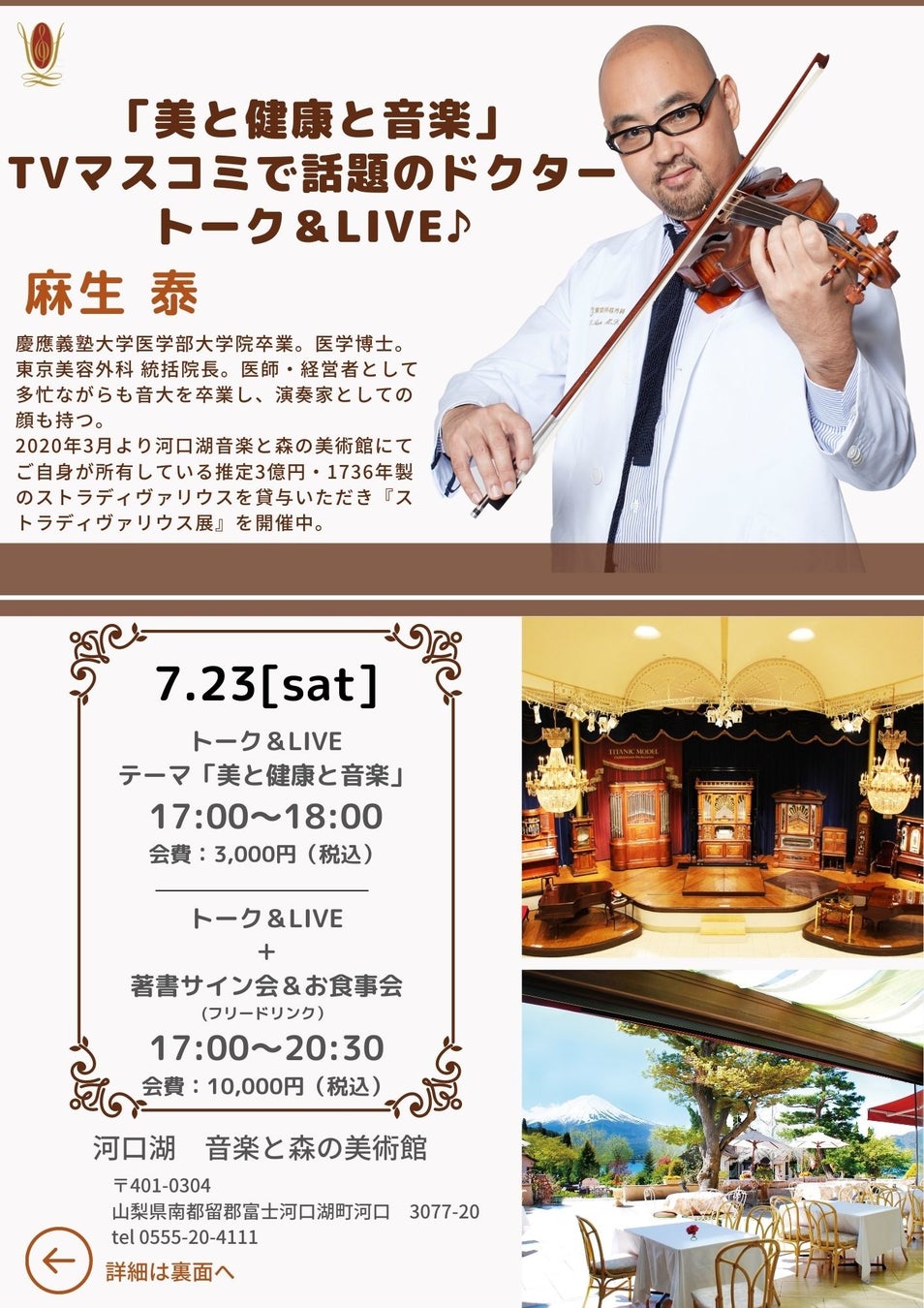 株式会社河口湖オルゴールの森(本社:山梨県南都留郡富士河口湖町、代表取締役:堀内 貴丈)は、2022年7月23日(土)に『麻生泰「美と健康と音楽」~TVマスコミで話題ドクターのトーク&Live~』を実施いたします。