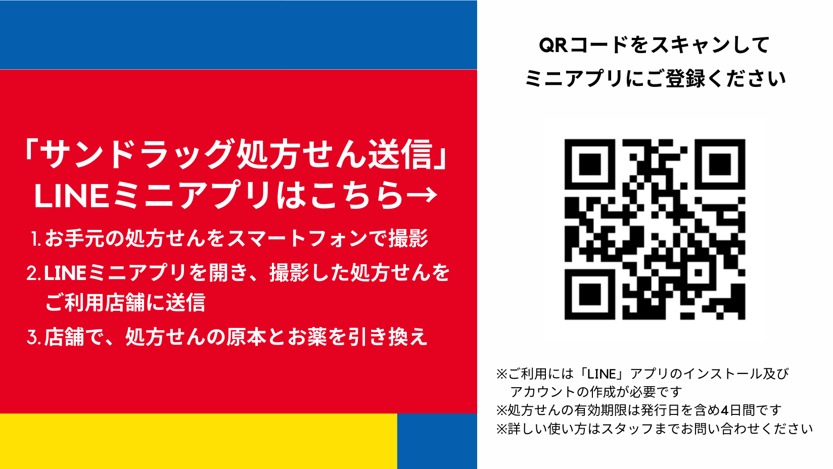 今後は、LINEミニアプリ内でオンライン服薬指導やお薬手帳等の機能追加を予定しており、サンドラッグの調剤薬局全店で、オンライン調剤機能をご利用いただけるようになります。また、店頭での声がけや案内表示の制作など、患者さんへのお知らせにも共同で取り組んでまいります。