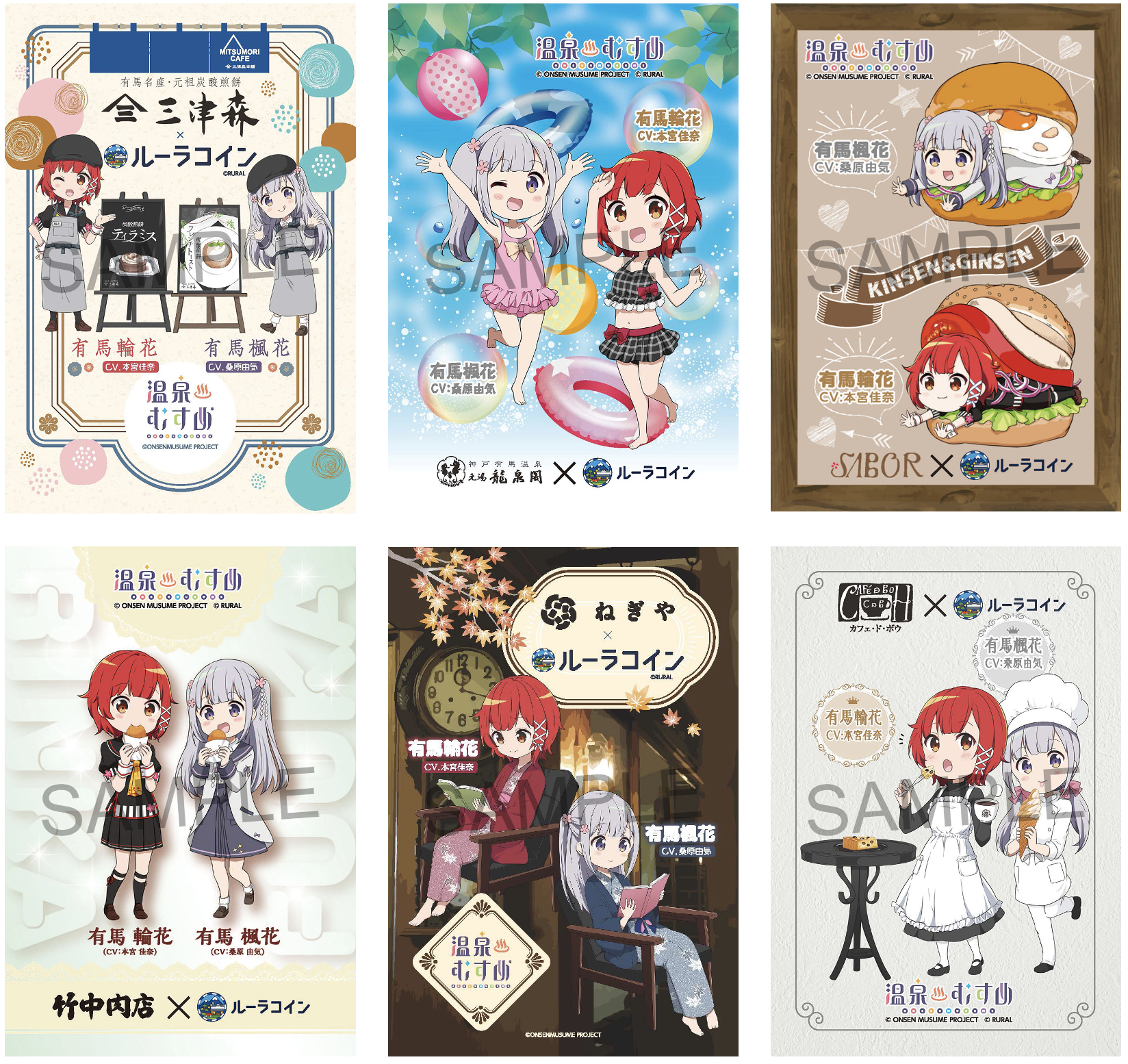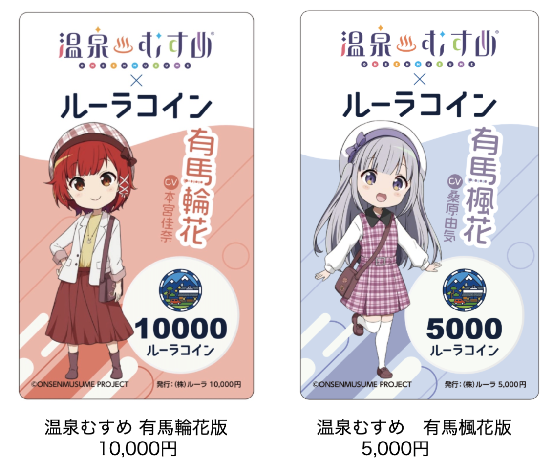 有馬温泉エリアのルーラコイン対象加盟店にて、ルーラコインで1,000円以上お買い物すると、有馬温泉の温泉むすめ姉妹「有馬輪花」と「有馬楓花」の書き下ろしイラストを使用したオリジナルポストカードが特典として貰えます。