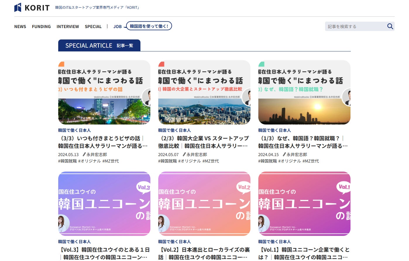「MZ世代特集」「韓国で働く日本人」「韓国VC」など、KORITだけのオリジナル記事がSPECIAL(特集)ページに集結!特集ごとに整理され、より見やすく、さらに過去の記事を探しやすくなりました。