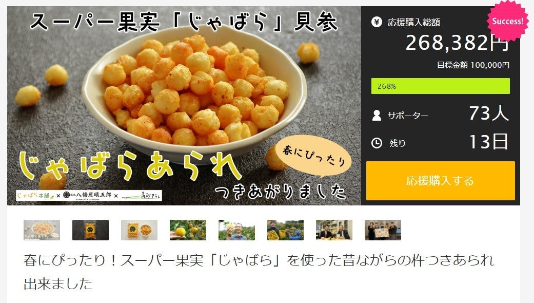 【開始初日に目標達成】和歌⼭県の幻の果実と老舗メーカーのコラボ「じゃばらあられ」クラウドファンディング実施中