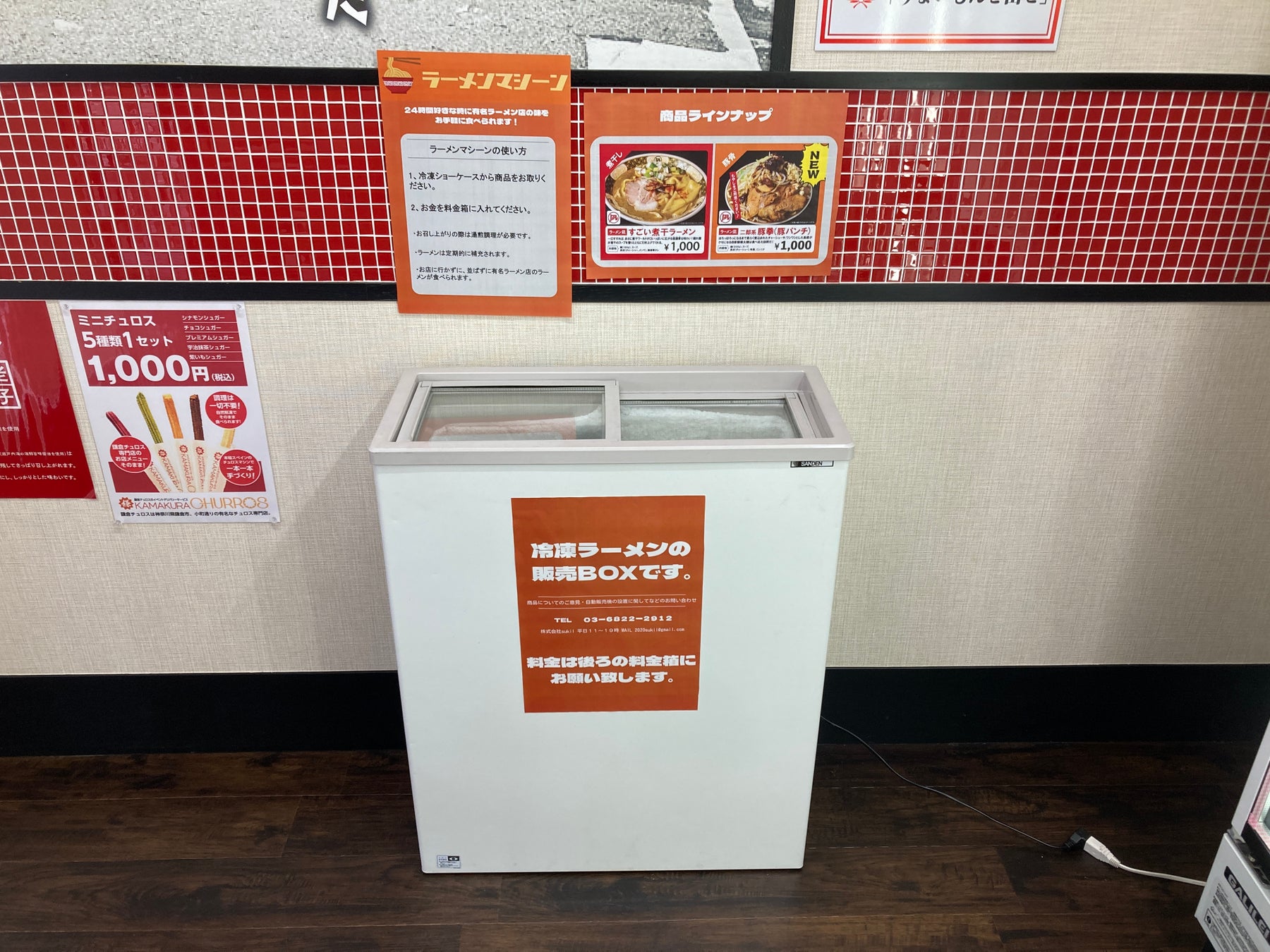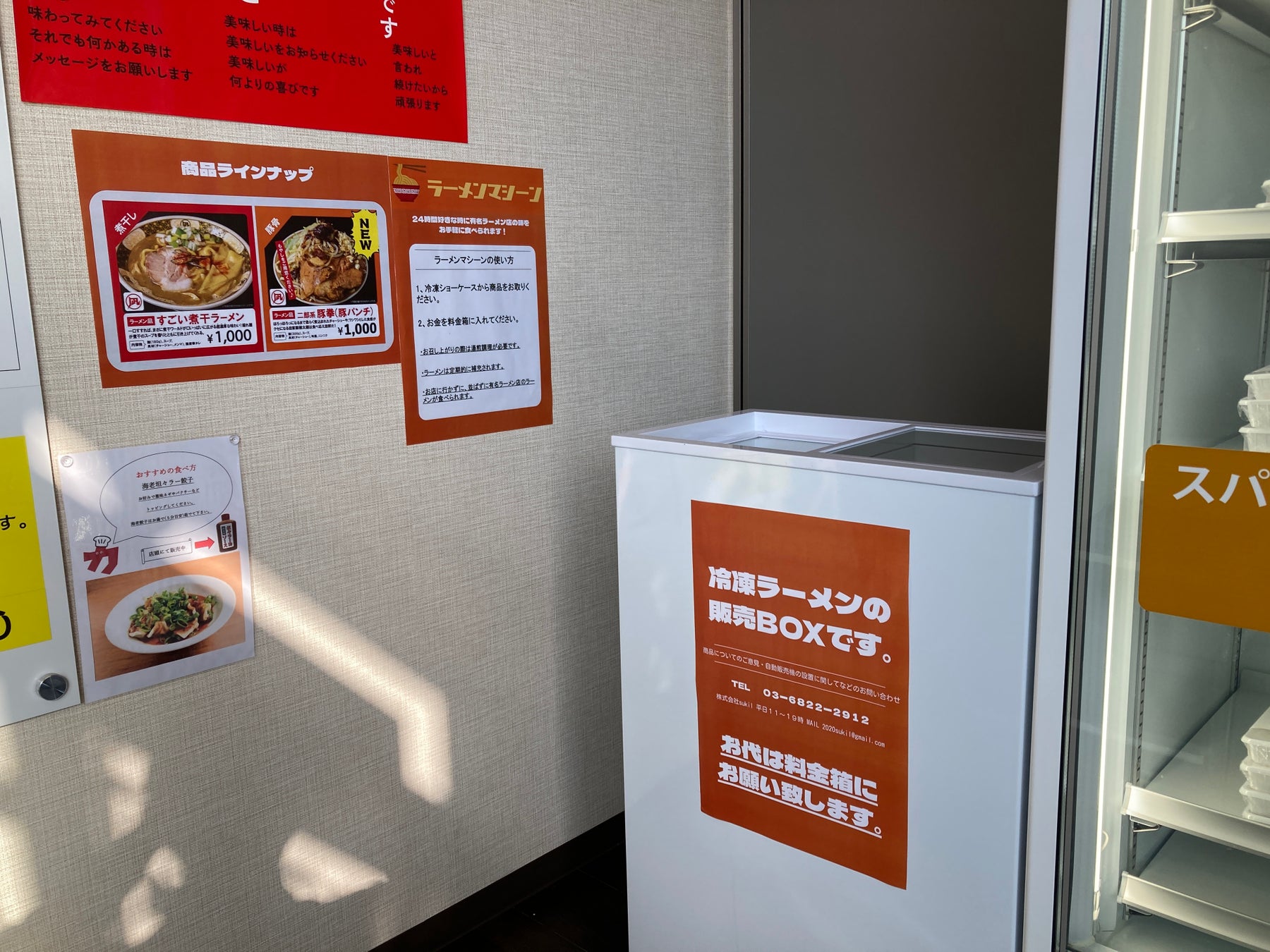 『ラーメンマシーン立石店』は餃子のチカラ店舗内の設置となっており、冷凍ボックスでの販売になっております。