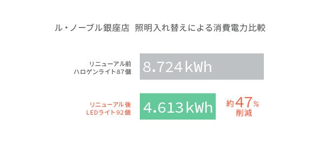 従来の消費電力は、ハロゲンライト87個で8.724kWhでしたが、LEDライト92個に変更後は4.613kWhとなり、約47%の削減に成功しました。東京都中央区の「中央エコアクト(※1)」にも参加し、店舗運営で排出されるCO2の継続的な削減により環境への貢献を果たしていきます。