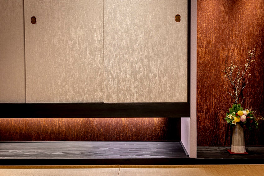 世界の一流ブランド(デイオール・エルメス・カルティエなどが使用している)株式会社 細尾の西陣織を襖に取り入れました。角度によっていろいろな表情を示す日本の伝統工芸 西陣織。その背景には20もの工程があります。それぞれの職人の技が結集して出来上がった西陣織。目で見て肌で感じて頂けると幸いです。