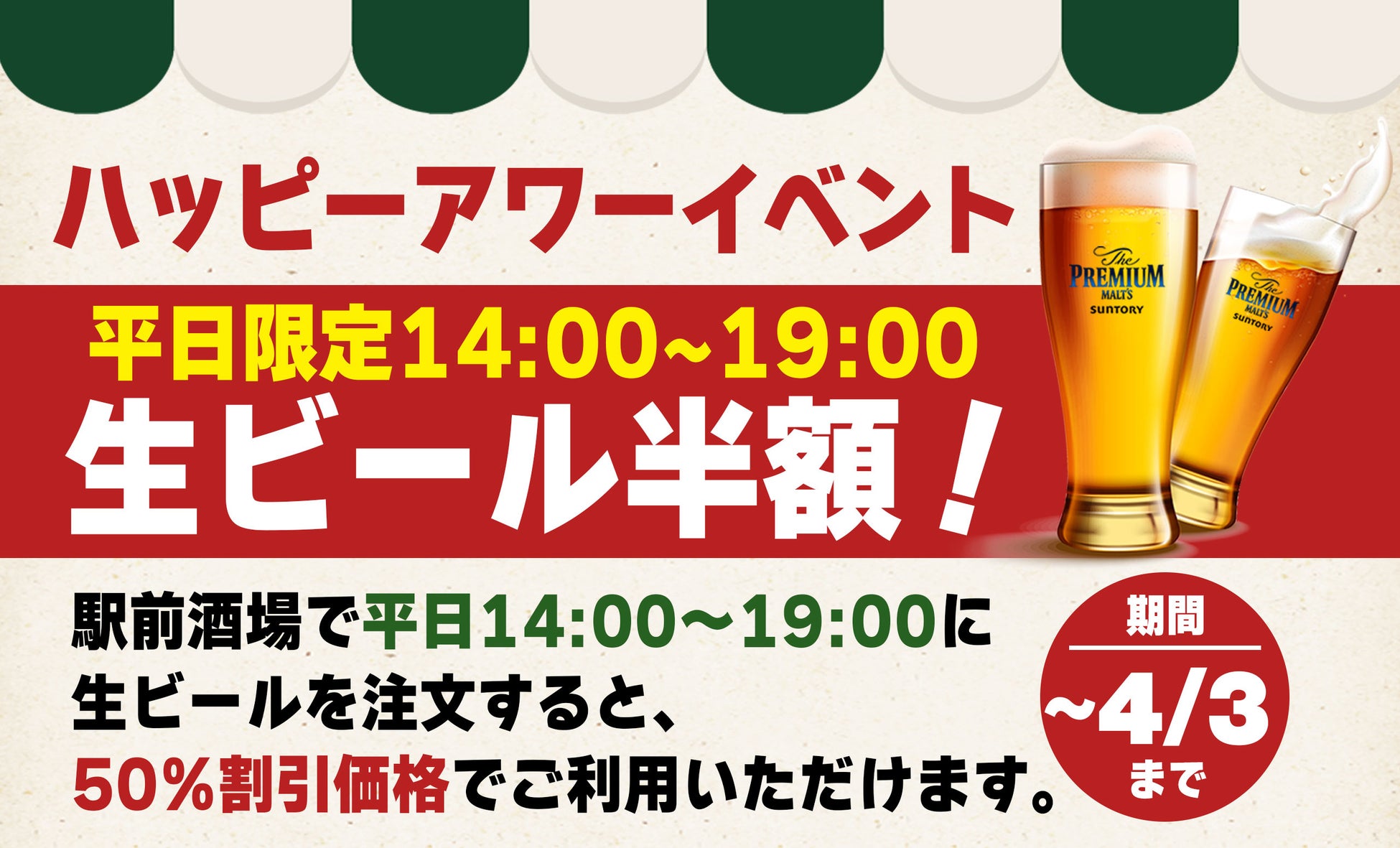 ご好評につきオープンを記念して「ハッピーアワー!生ビール半額キャンペーン」
