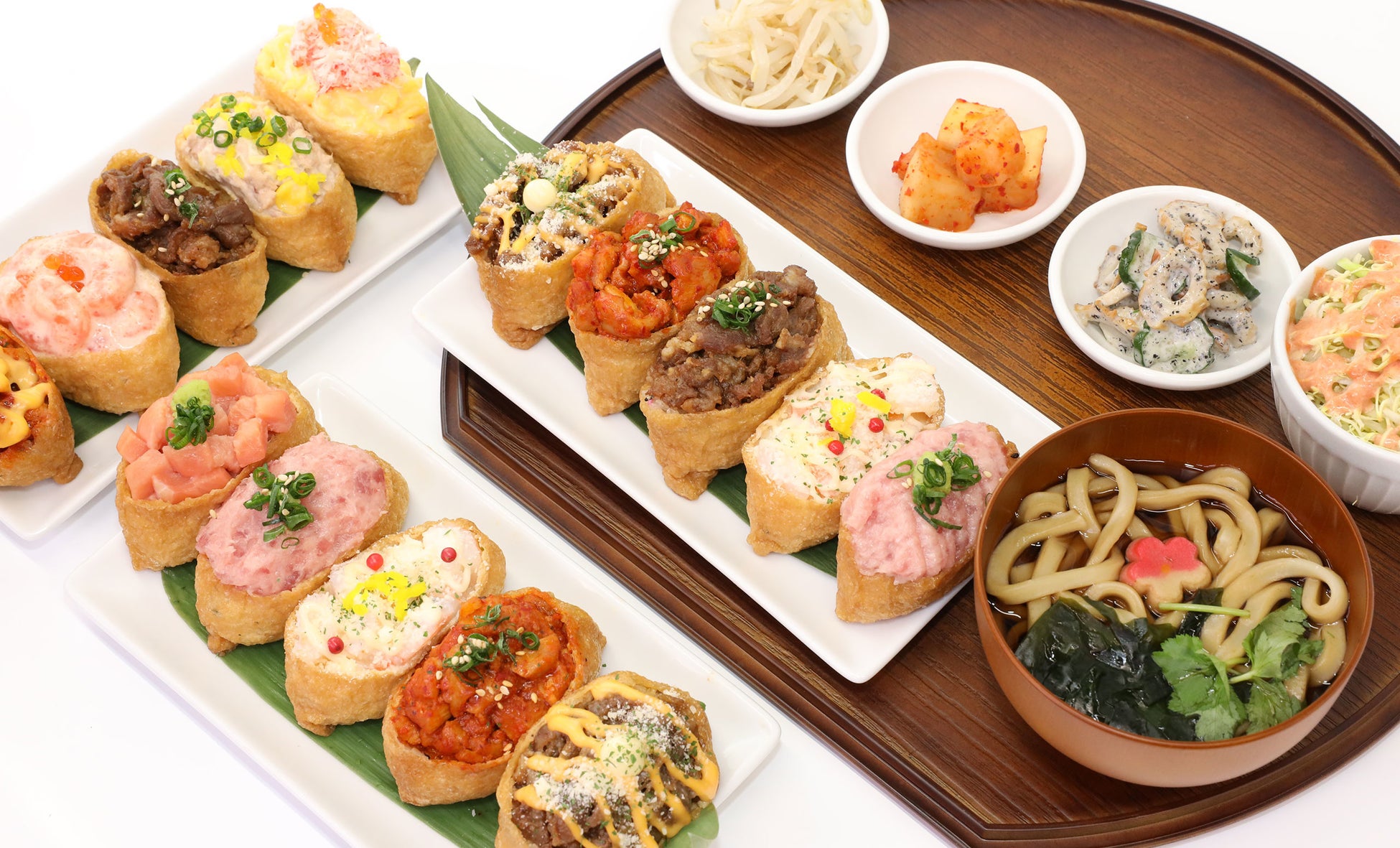 ランチ限定で「韓国いなり寿司(ユブチョバプ)セット」を販売して自分で選べる5種のいなり寿司とスープ、日替わりおかず3種と一緒に楽しめます。明太子エビ、プルコギ、チーズタッカルビなど10種の「韓国いなり寿司」は駅前酒場しか食べれません!