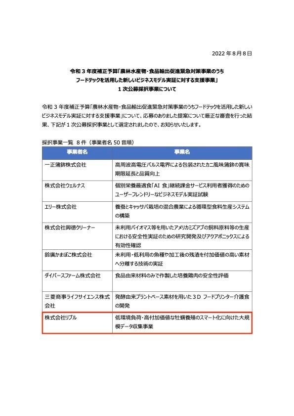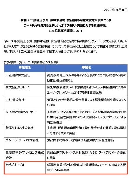 牡蠣のスマート養殖事業を展開する株式会社リブル(所在地:徳島県海陽町、代表:早川 尚吾/岩本 健輔)は、農林水産省が実施する「フードテックを活用した新しいビジネルモデル実証に対する支援事業」の交付先として採択されたことをお知らせします。