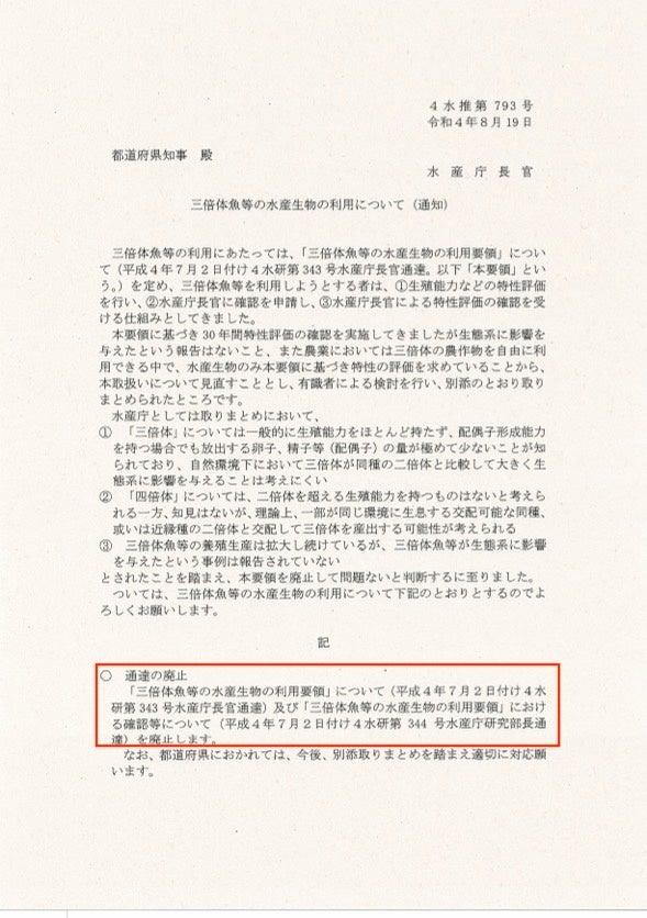 水産庁『三倍体等の水産生物の利用について(通知)』一部抜粋