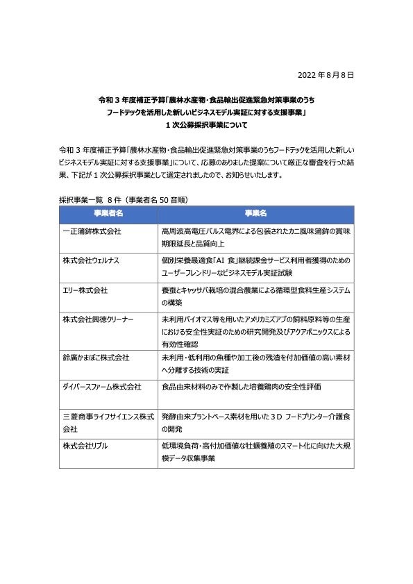 - リブルの取り組みが「フードテックビジネスモデル実証事業」に採択