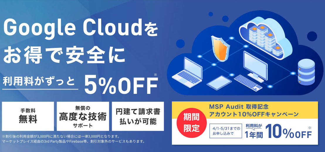 株式会社G-genは2022年1月に取得いたしましたMSP認定を記念いたしまして、日頃の感謝をより多くのお客様に還元することを目的といたしまして、Google Cloudを10%オフで1年間利用可能なキャンペーンを実施いたします。