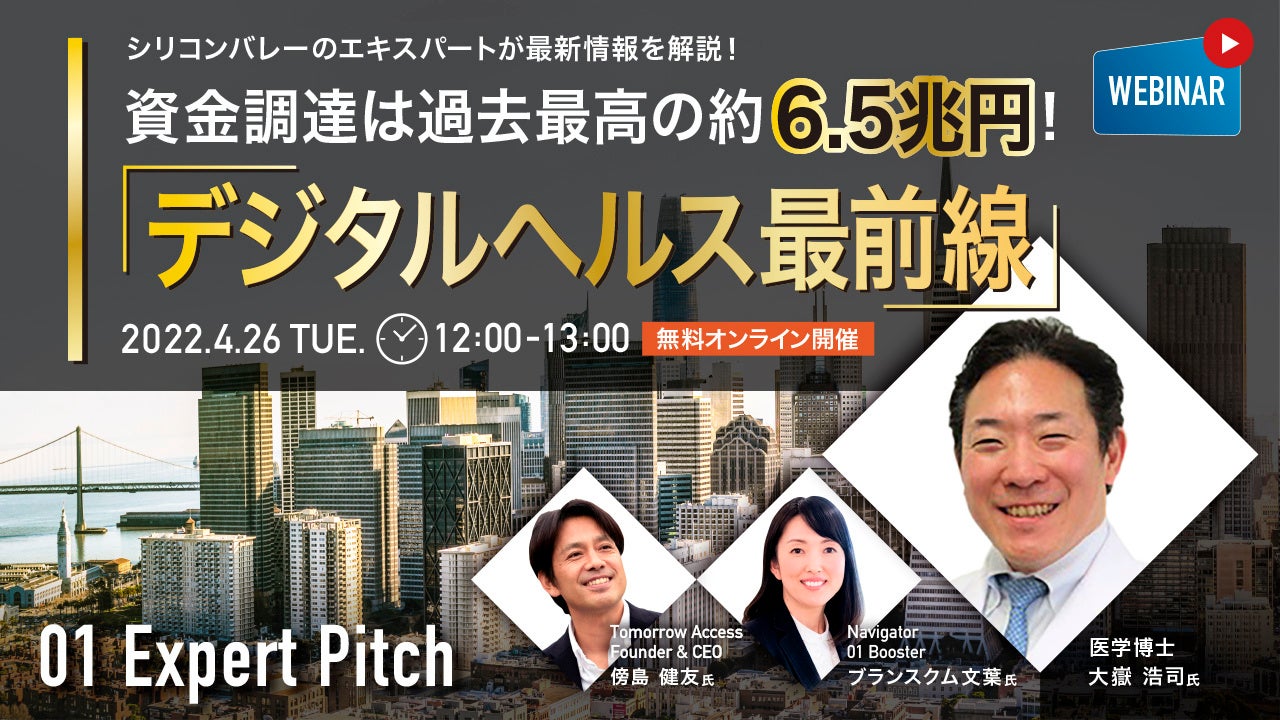 日本とシリコンバレーを繫ぐコンサルティング会社 Tomorrow Access LLC(本社:米国カリフォルニア、Founder & CEO:傍島 健友)は、株式会社ゼロワンブースター(本社:東京都千代田区、代表取締役CEO:合田 ジョージ)と共催で「デジタルヘルス」をテーマにした無料オンラインウェビナー「01 Expert Pitch #10」を開催します。