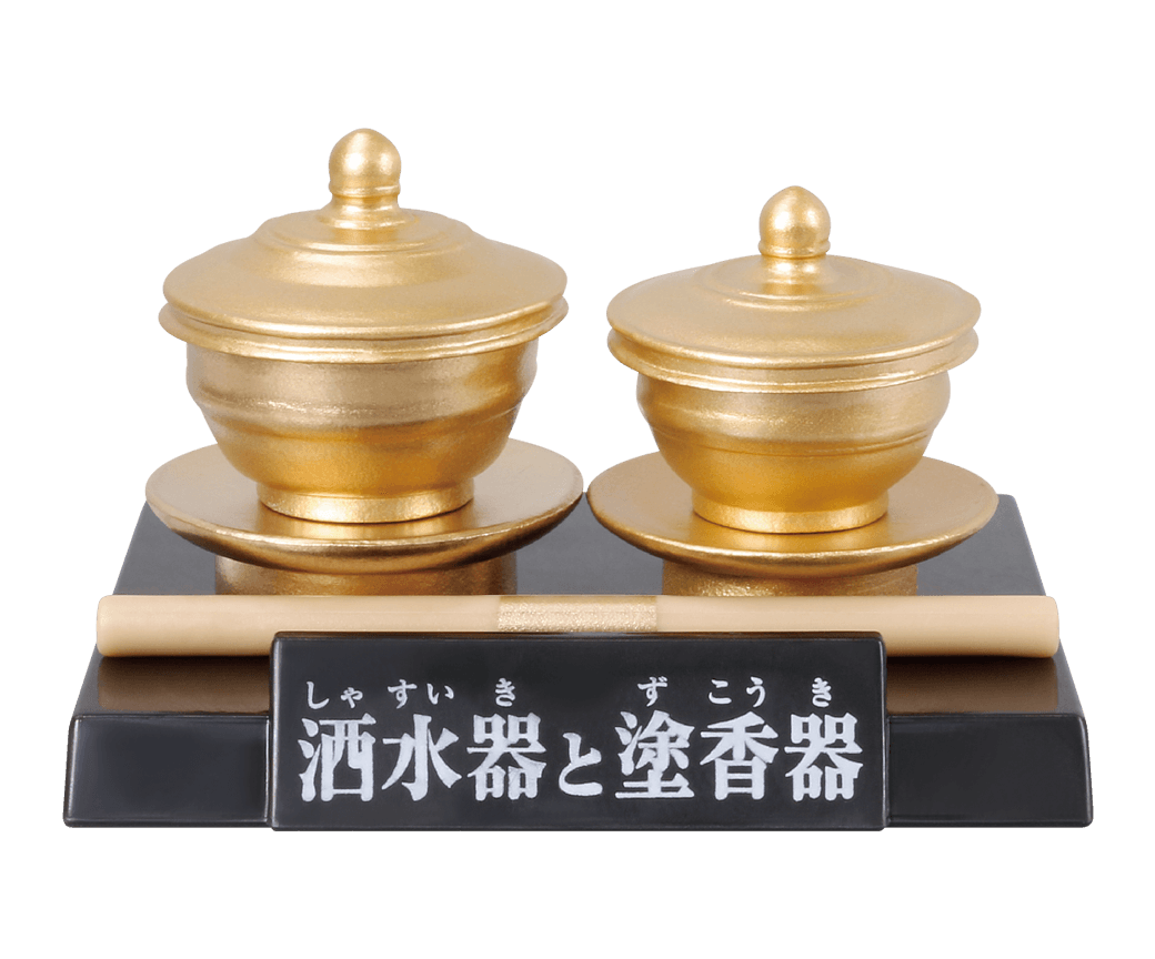 そのように水を入れて散らし、身を清めるための道具であることから「洒水器」と呼ばれており、洒水器よりも一回り小さな金属製の器「塗香器」と合わせて一般的に二器とされています。
