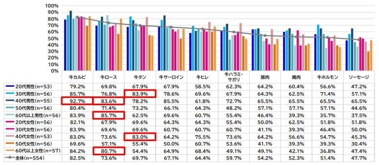 全体では「牛カルビ」82.5%、「牛ロース」73.6%、「牛タン」69.7%の順。