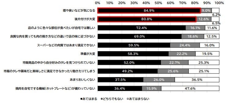 20代以上の全国男女554名に聞いた『おうち焼肉に関する調査』おうち焼肉の不満は?「煙や臭いが気になる」「後片付けが大変」が8割超え