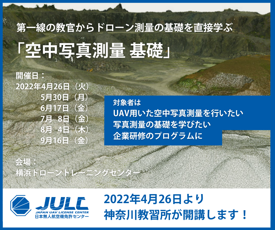 無人航空機の操縦に関する教育、指導および資格認定、検定試験を展開する日本無人航空機免許センター株式会社(本社:東京都中央区、代表取締役:松本 篤史、以下 JULC)は、無人航空機を使用した空中写真測量の基礎を学べる講習を、JULC神奈川教習所にて2022年4月26日より開始し、講習スケジュールを公開しました。