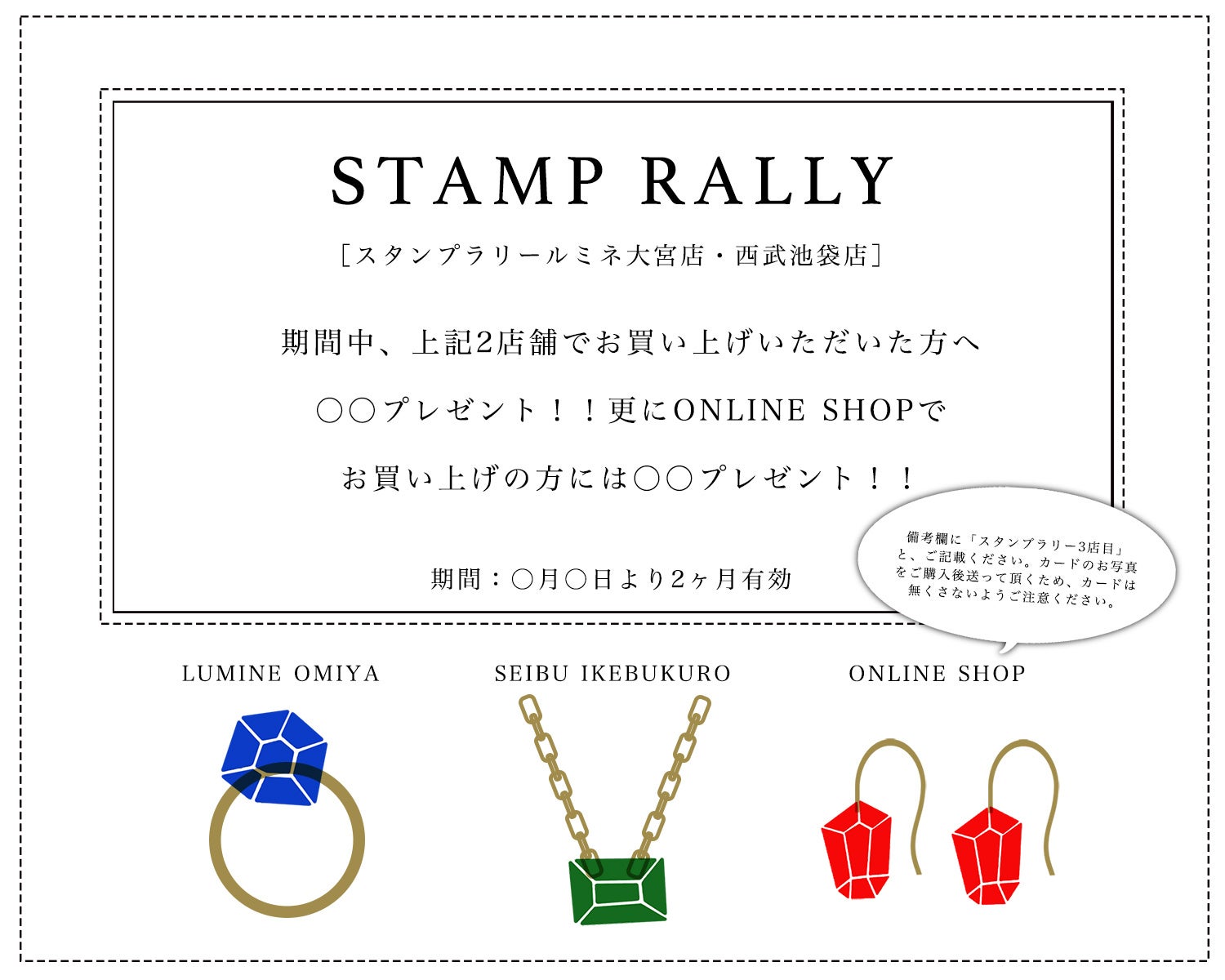 オープンを記念いたしまして、ルミネ大宮店でお買い物をしてくださった方へ、オリジナルジュエリークロスまたはオリジナルアルコールスプレーをプレゼントいたします。