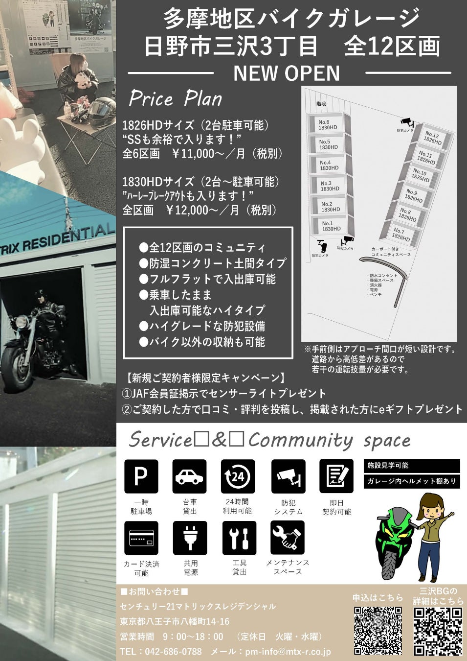 「多摩地区バイクガレージ 日野市三沢」を、2023年4月1日にオープン。