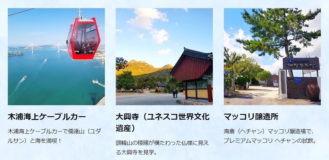 このツアーで注目いただきたいのが、全羅南道の中でも個人では足を延ばしにくい谷城(コクソン)と海南(ヘナム)を訪問すること。 順天(スンチョン)の干潟で獲れた海の幸を食し、谷城で蒸気機関車体験、木浦(モッポ)で歴史探訪と360度のパノラマを楽しめる海上ケーブルカーに乗車、海南でユネスコ世界文化遺産の寺院とプレミアムマッコリの醸造場を訪問。