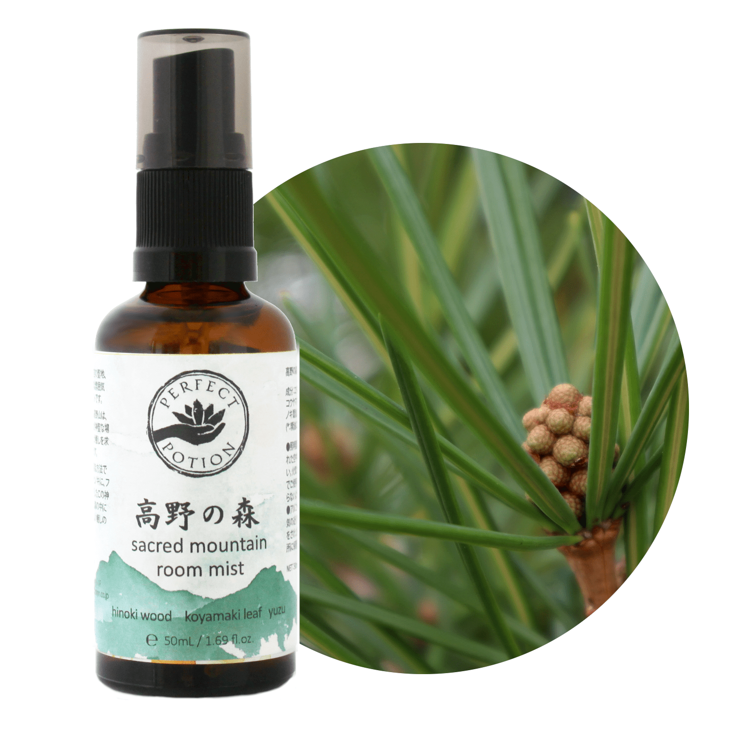 和歌山の高野山で育ったコウヤマキやヒノキのの精油などを使用した高野の森ブレンドのルームミスト。お部屋に神聖な森の香りが広がります。