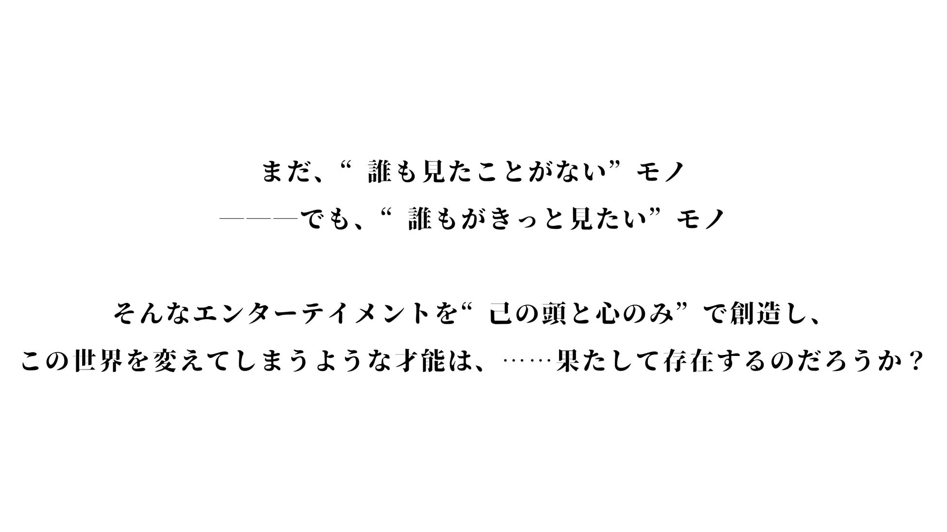 「まだ誰も見たことがないけれど、誰もがきっと見たい」そんなエンターテインメントを「己の頭と心のみ」で創造し、この世界を変えてしまうような才能は果たして存在するのだろうか?