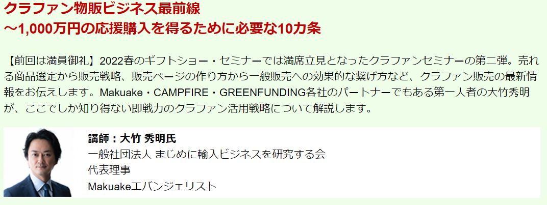 【前回は満員御礼】2022春のギフトショーでは満席立見となった大竹のセミナーの第2弾が決定。大竹主催の出展ブースも過去最大の規模で展開決定。クラファンに特化した新サービスの発表も。