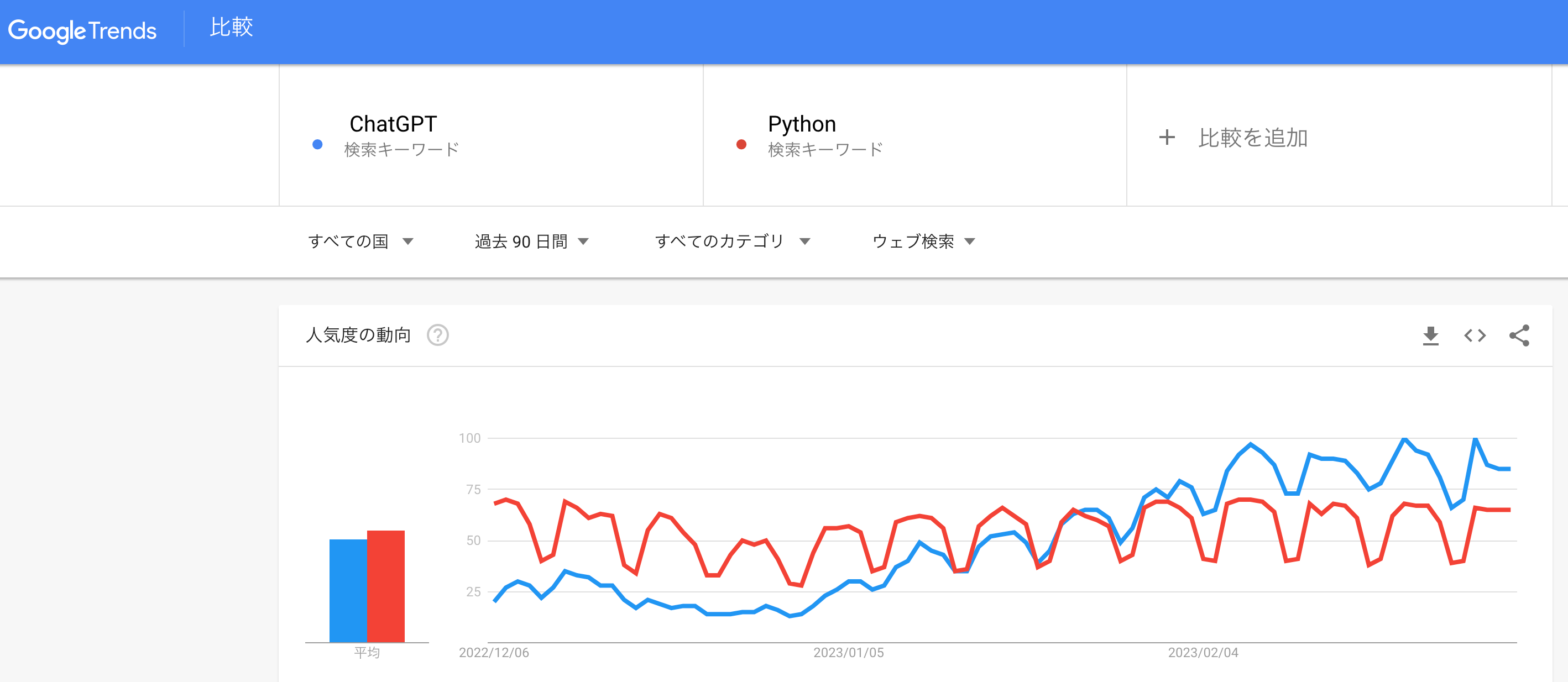 GoogleTrendによると、「ChatGPT」と世界で主流のプログラミング言語である「Python」のGoogle検索量を比較すると、2月中旬頃から世界的にChatGPTの検索量が上回るようになりました。また、検索パターンを分析すると、平日に検索量が多く、週末に検索量が下がる傾向があることから、ChatGPTが一時的なブームではなく、日々の業務ツールとして定着し始めていることが示唆されます。