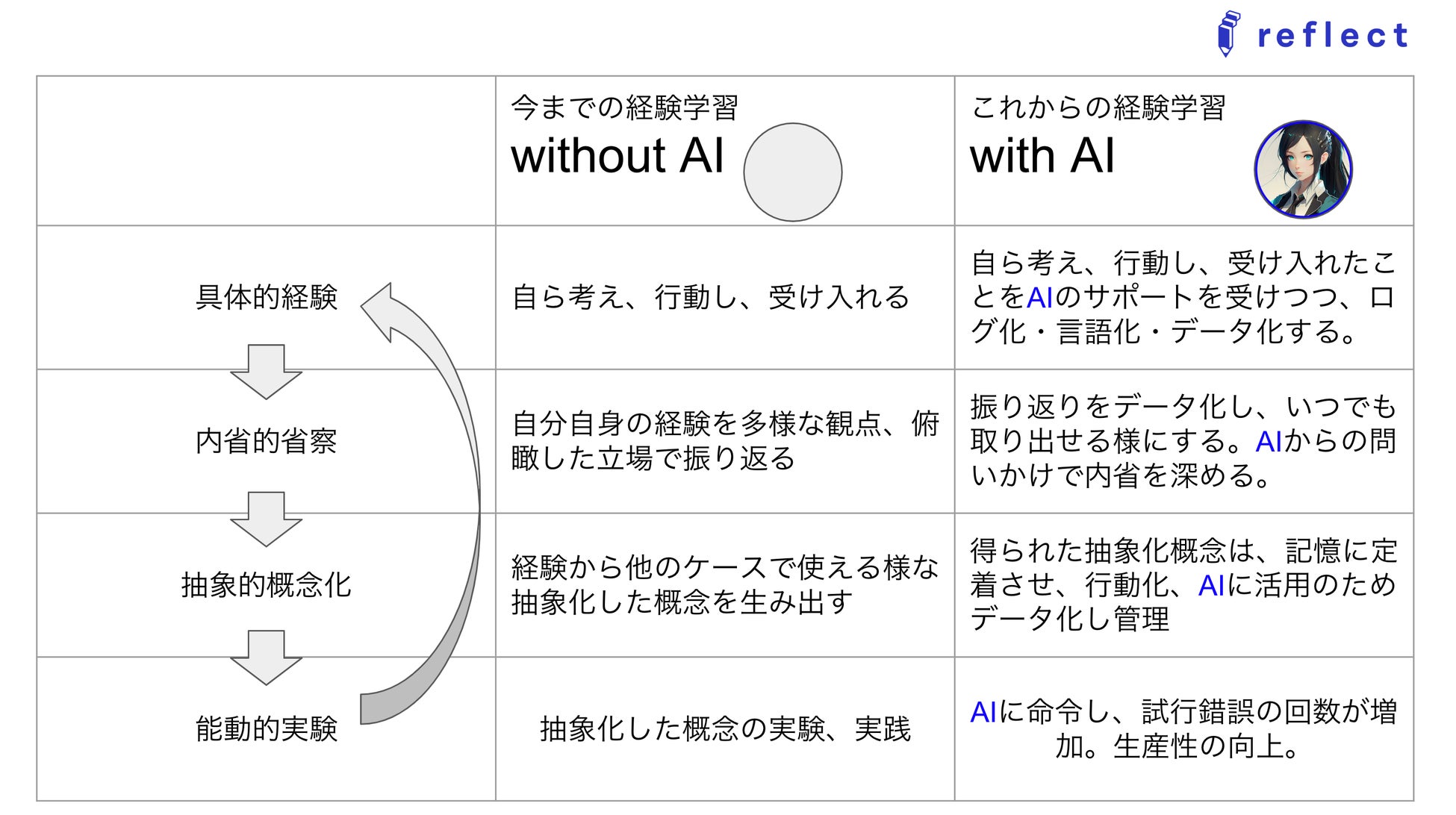AIに内省データをもとに問いかけることで、抽象的な概念化を深化させることができると考えられます。また、抽象化した概念を実行する能動的実験についても、AIに命令することで、試行錯誤の回数が増加し、生産性を上げることができます。これにより、経験学習モデルの進化が促進され、より効果的な学習が可能となります。