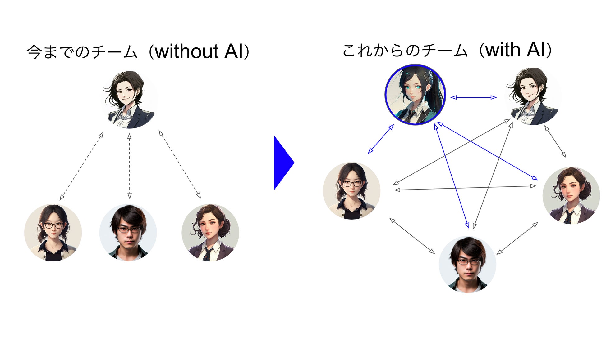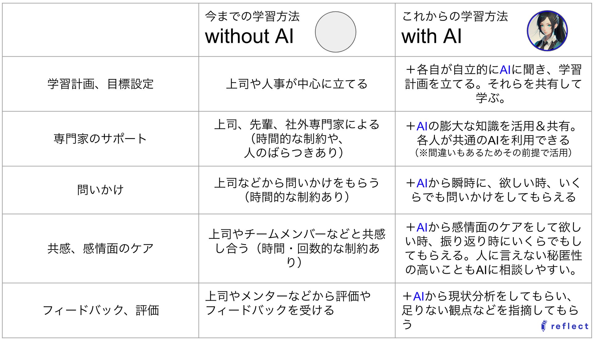 AIを始めとするテクノロジーの進化により、2023年は「with AI」の時代が到来したと考えられます。これまでの時代を「without AI」の時代とした場合、学習方法や経験学習の流れが変化してくると予想されます。