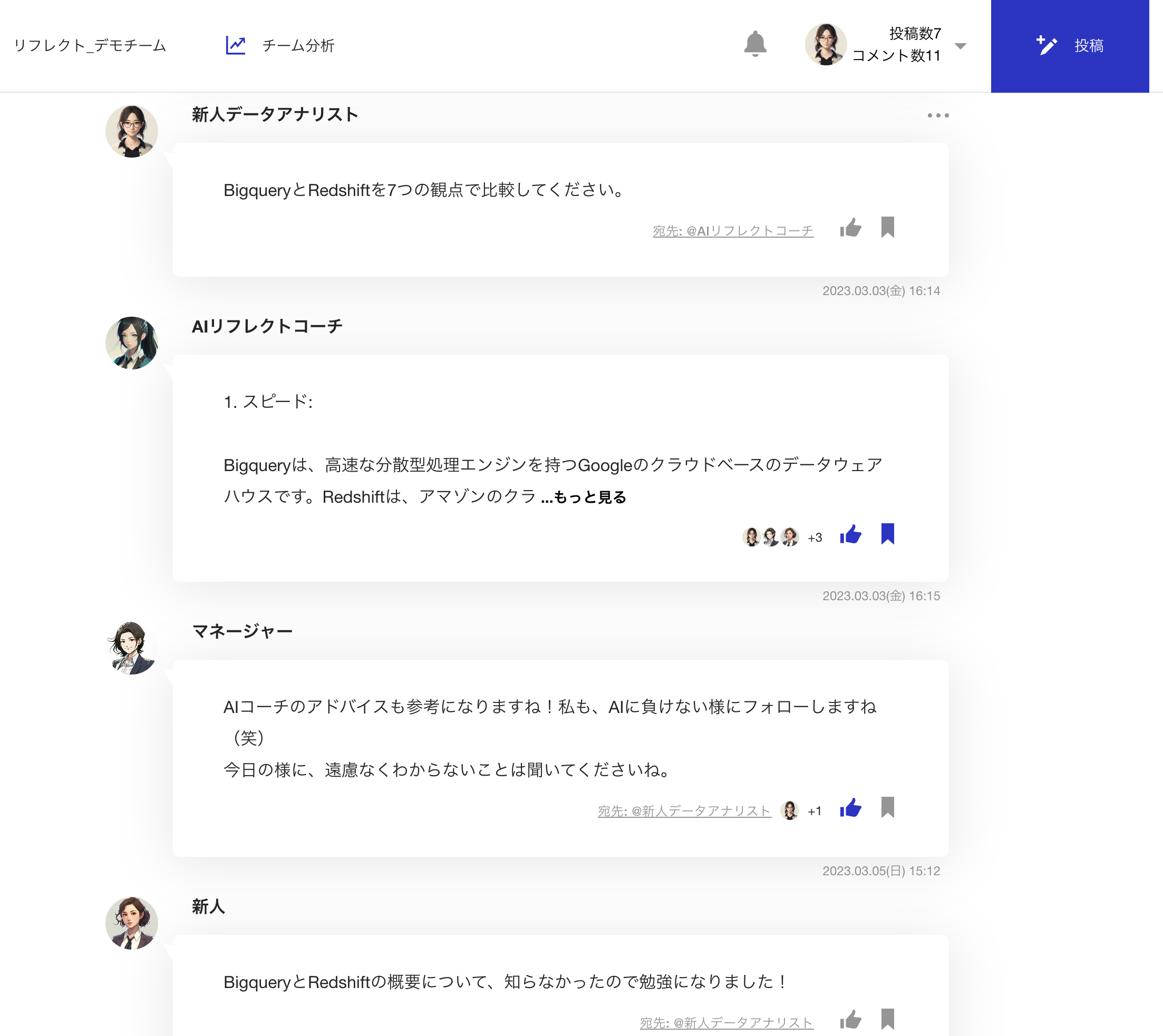 リフレクトは、AIを活用した革新的なチームリフレクションツールとして、人材開発領域において大きな注目を集めています。AIコーチ機能を使って、日々の業務における思考や行動を深め、より良い成果を生み出しましょう。