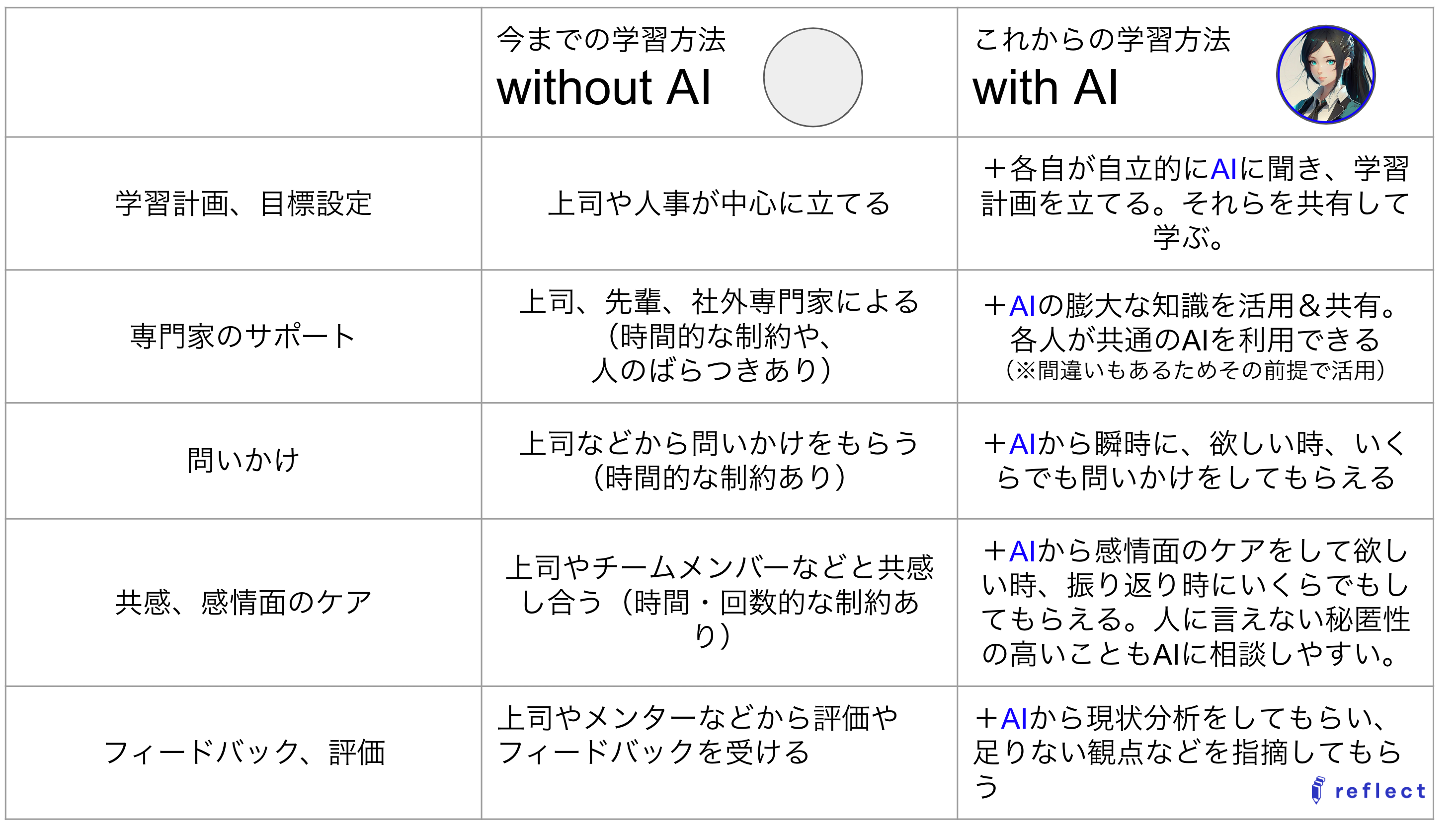 「with AI」の時代では、学習計画や目標設定において、上司や人事が中心に立てていたものが、各自が自立して学習計画や目標を設定することができるようになります。