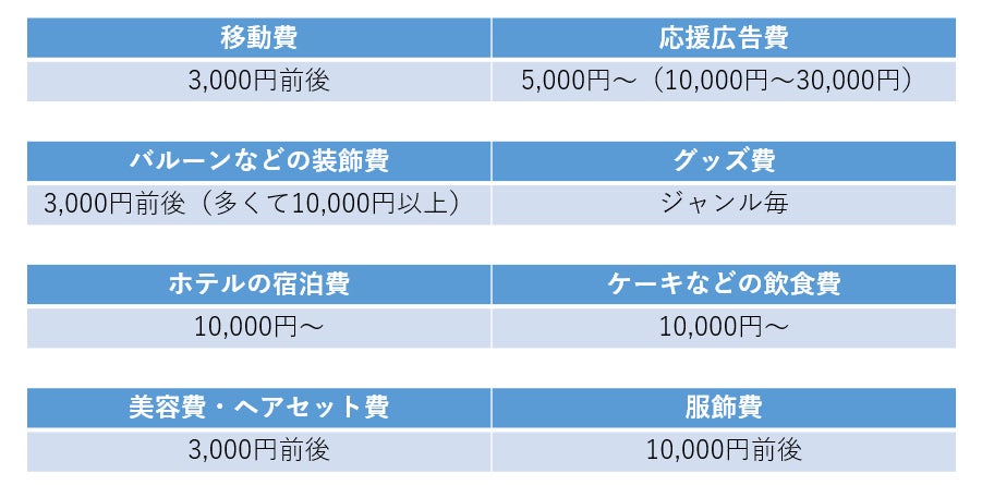 本人不在の誕生日会とはその名の通り、誕生日を迎える「推し本人」抜きで開催する、誕生日会のことです。アイドルやアニメのファンが、グッズや装飾を用いて推しの誕生を盛大に祝います。平均で10,000円~30,000円、多くて70,000円~80,000円使うこともあります。