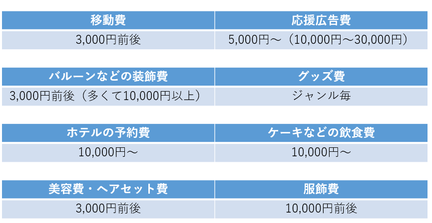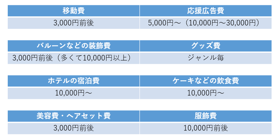 荷物が多くなる誕生祭ではスーツケースでの移動が多く、ホテルまでの移動費もかかります。グッズに関しては二次元推しが特に支出が多く、数万円かけることも。このように消費行動には推しているコンテンツごとに傾向があります。