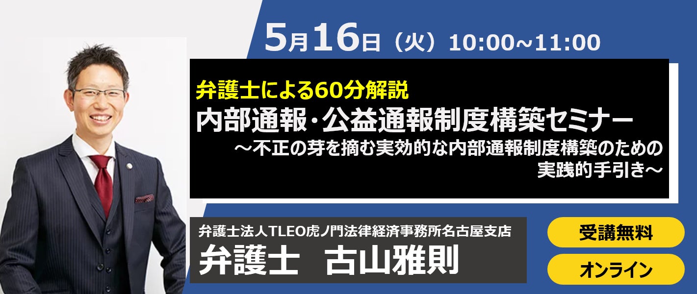 タイトル:「企業のための内部通報・公益通報制度構築セミナー ~不正の芽を摘む実効的な内部通報制度構築のための実践的手引き~」