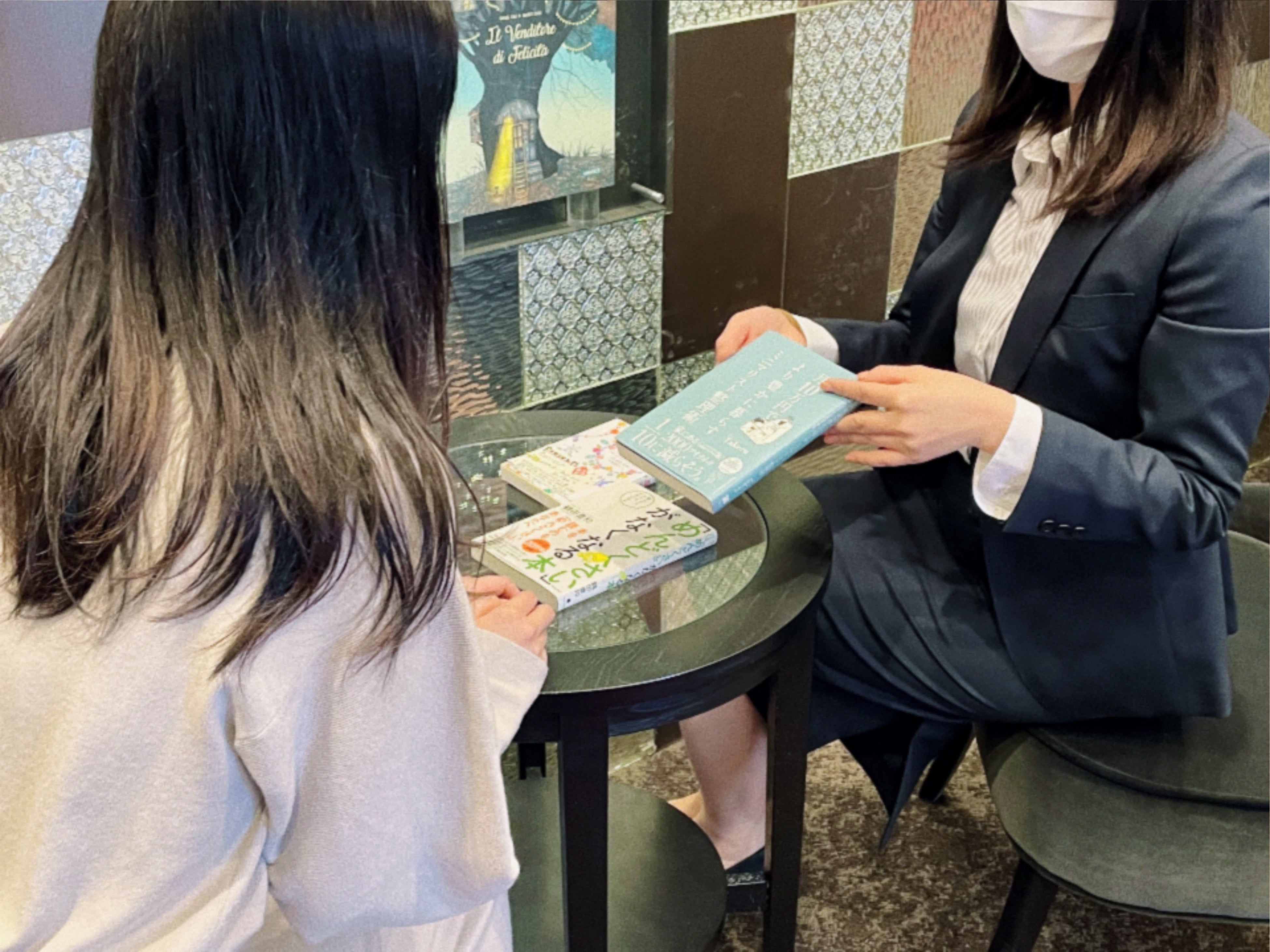 これは、お客様の日頃の悩みや、解決したいことを30分ほどヒアリングし、その時に最適な本をご提案するサービスです。