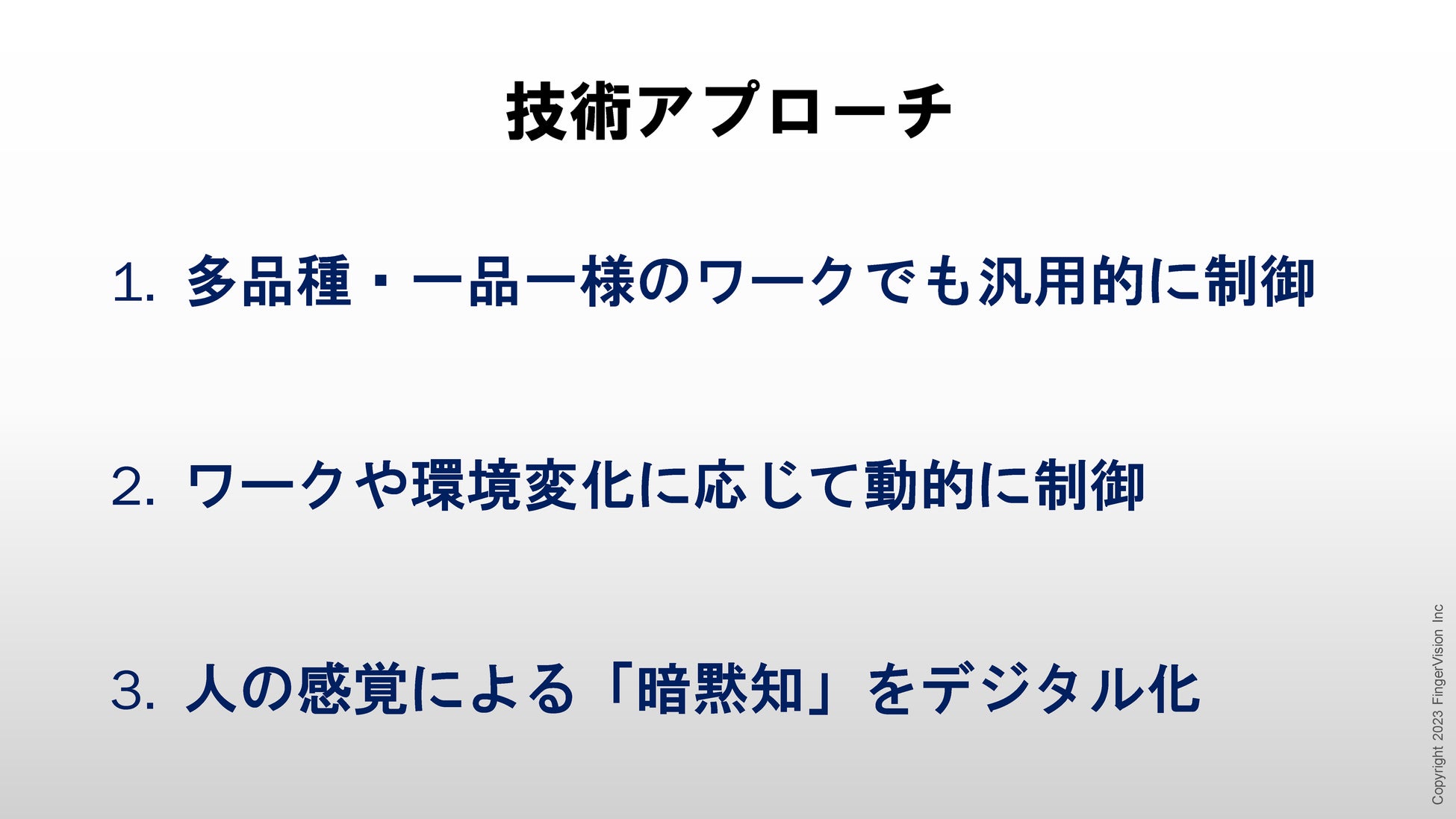 この点、当社の技術アプローチでは、ハンドや指に搭載されたセンサから取得された視覚・触覚情報をもとに、物体操作を正確に行えるようになることに加えて、「滑り」の発生分布をロボット制御の要として利用することで、種々雑多なワークに対しても、事前学習なしでシンプルかつ同一の制御ロジックを活用することができ、ロボットシステムの「汎用性」を実現しています。