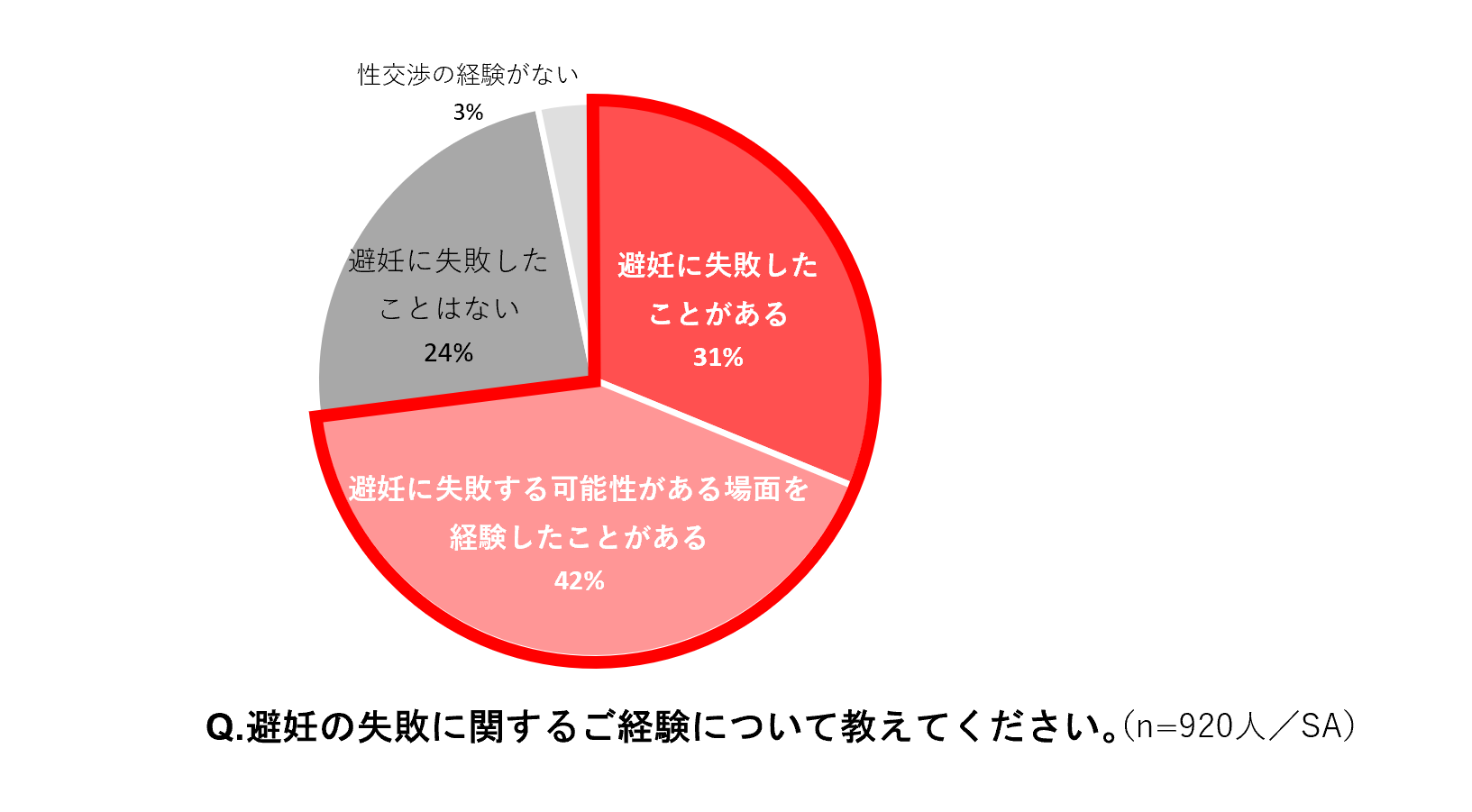 「コンドームが破れた・外れたなども含め、避妊に失敗したことある」と回答した人は31%、さらに「腟外射精などを含め、避妊に失敗する可能性がある場面を経験したことがある」と回答した人は42%となりました。