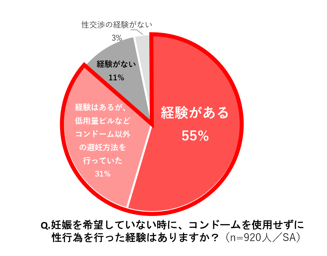 半数以上が「妊娠を希望していない時に、コンドームを使用せずに性行為を行った経験がある」と回答されていることから、腟外射精による避妊が一般的に行われていることが予想されます。実は、腟外射精は全く避妊にはなりません。挿入中に尿道から漏れ出てしまう分泌液中に少なからず精子が含まれているためで、なんと約22%の確率で妊娠するというデータもあります。*1