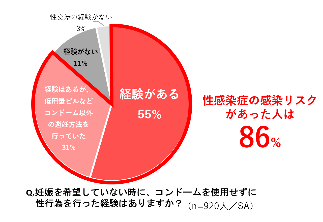 さらに約3割が「コンドームを使用せずに性交渉を行った経験はあるが、低用量ピルなどの避妊方法を行っていた」と回答しました。他の避妊方法を行っていたとしても、コンドームを装着しなければ性感染症に感染する可能性はあるため、8割以上の人が性感染症にかかるリスクがあったこともわかりました。