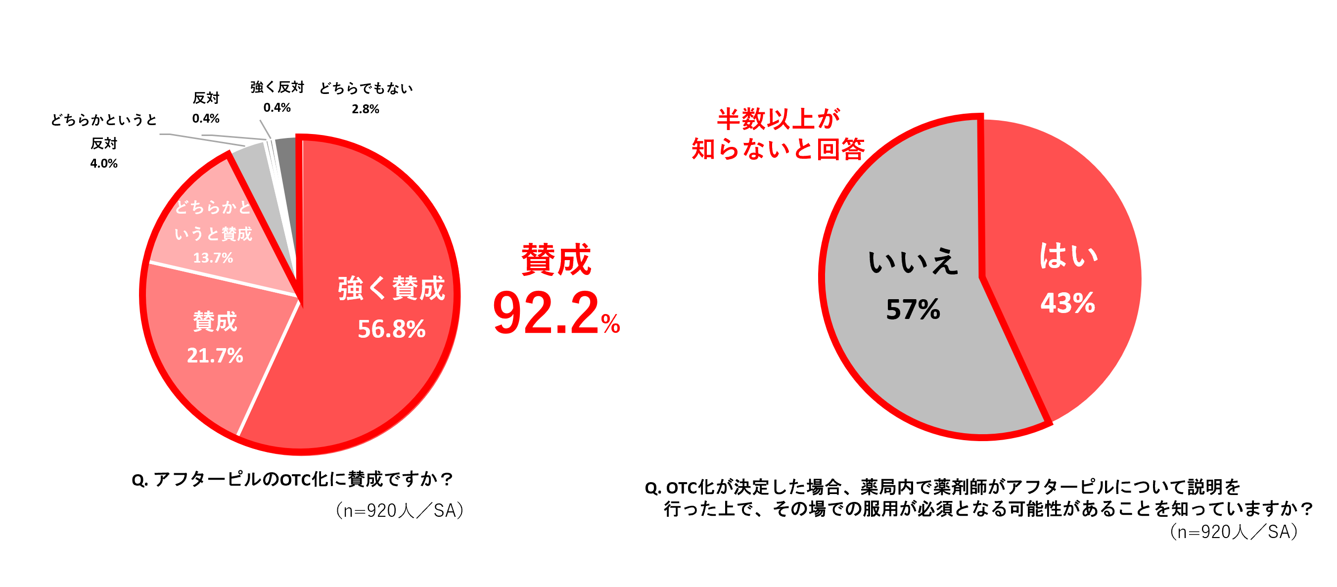 現在アフターピルは医師の処方箋が必要な薬ですが、政府は処方箋がなくても薬局で買えるようにするOTC化の検討を進めている中、OTC化に賛成かどうか質問したところ、約9割が賛成と回答しました。