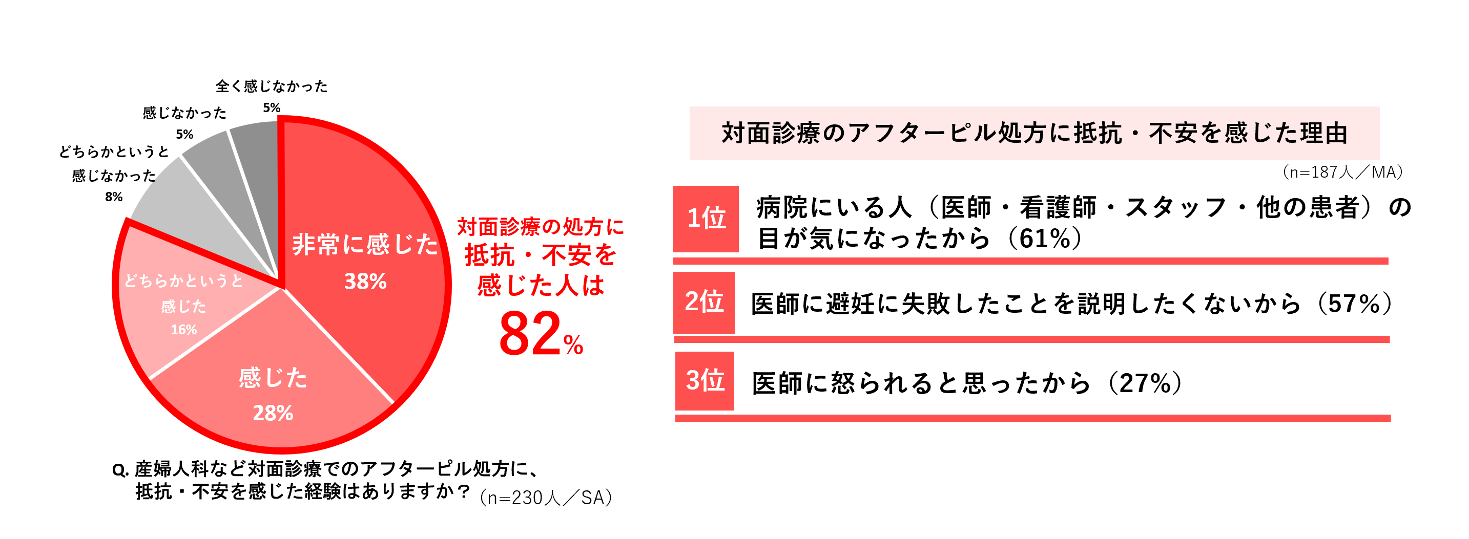 産婦人科などの対面診療でアフターピルを処方してもらった人に、抵抗・不安を感じた経験があるか質問したところ、約8割が「抵抗・不安を感じた」と回答。さらに、その理由を質問したところ、最多が「病院にいる人(医師・看護師・スタッフ・他の患者)の目が気になる」、2番目は「医師に避妊に失敗したことを説明したくないから」、3番目は「医師に怒られると思ったから」という結果になりました。