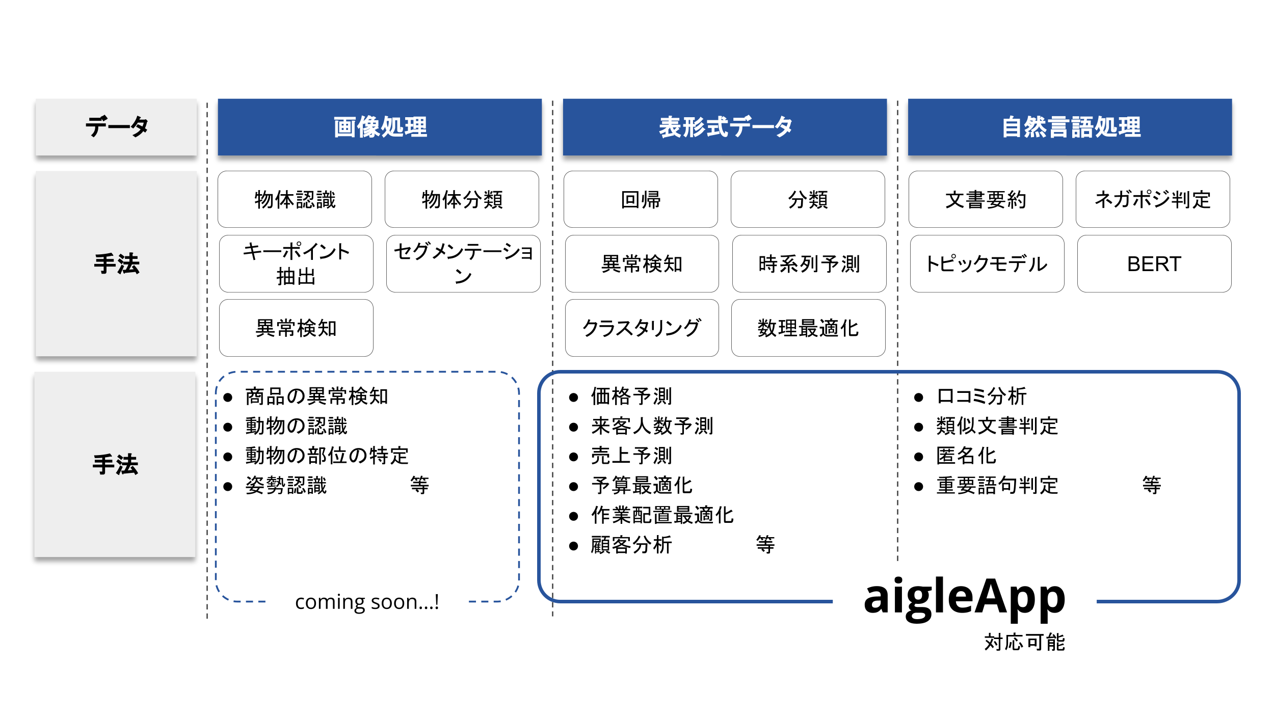 aigleAppで対応可能な案件種別に限り、機能改善や弊社の事例掲載にご協力頂く前提で、特別価格にて機械学習モデル構築をお手伝いさせて頂きます。