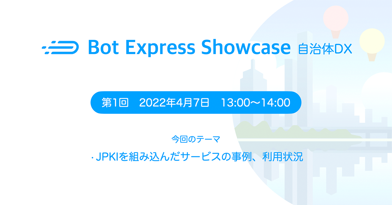 ほとんどの住民が、今、すぐに利用できるオンライン行政窓口プラットフォームサービス「GovTech Express」を提供する株式会社Bot Express(本社:東京都港区、代表取締役:中嶋 一樹、以下 Bot Express)は、4月7日(木)に初の自治体DX事例共有イベント「Bot Express Showcase自治体DX #1」を開催いたします。