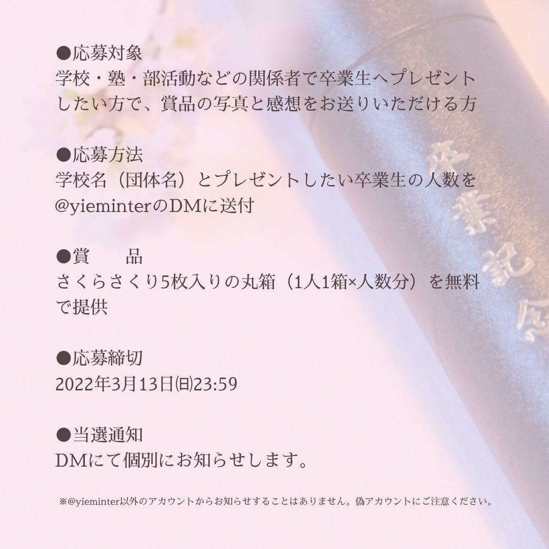 - 【応募方法】学校名(団体名)とプレゼントしたい卒業生の人数を@yieminterのDMに送付