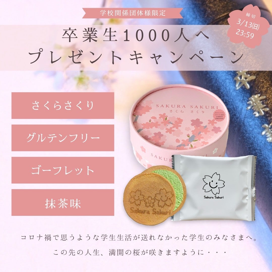 「コロナ禍で卒業式を迎えられる学生の皆様を対象に、“卒業おめでとう”を伝えたい」。「さくらさくり~玄米粉で焼き上げたグルテンフリーゴーフレット 抹茶味~」を1000名様に無料配布を発表