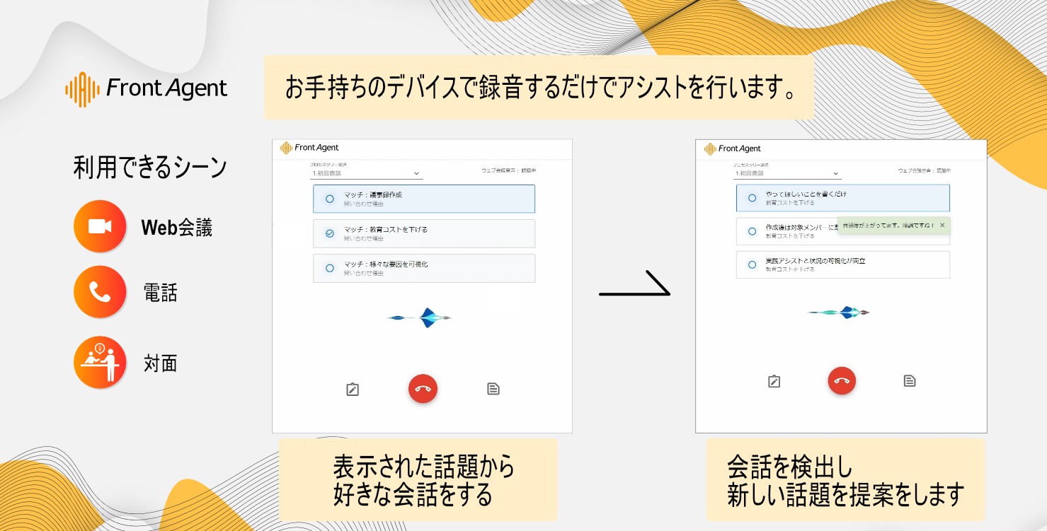 「Front Agent®」はオンライン会議などでAIが同席し、成功要因の解析付き音声議事録と会話中のアシストを行います。