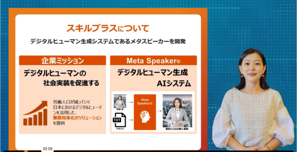 以前は、デジタルヒューマンの作成には高度なCG技術が必要で、多くの時間と費用がかかり、利用できる企業に制限がありました。しかし、Meta Speaker®を用いると、少ない工数とコストでデジタルヒューマンを生成でき、撮り直しなど必要とせずに修正も容易なため、今後は多くの企業がこれらの技術を手軽に利用できるようになります。