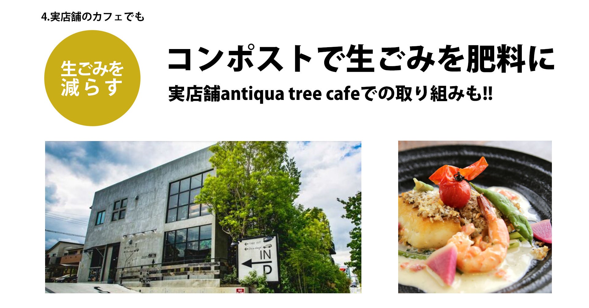 アンティカの実店舗「antiqua tree cafe」では、調理の際に発生する生ごみの一部を微生物の働きを活用して発酵・分解させ堆肥に変えるコンポストを実施しています。ゴミの焼却が減るため、処理に使う二酸化炭素の排出量を削減でき、出来上がった堆肥は植物や野菜の肥料となります。