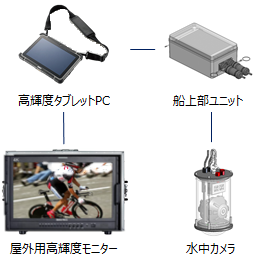 底面あるいは側面のカメラにより水中での施工管理や潜水士の安全確認など1台で広範囲の撮影が求められる現場で使用されます。