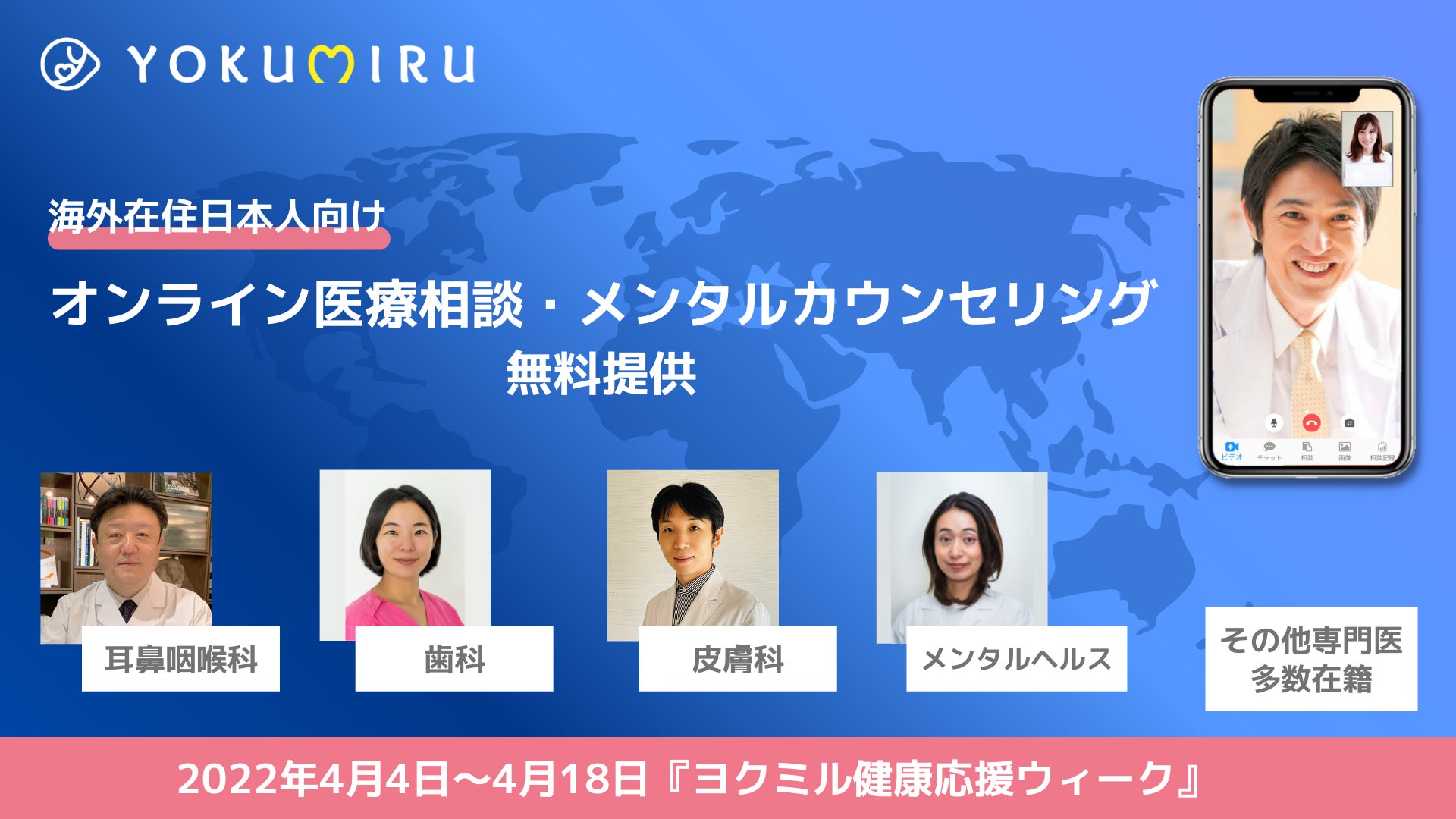 オンライン医療相談サービスを提供しているYOKUMIRU株式会社(本社:東京都渋谷区、代表:原 翔平)は、2022年4月4日(月)から4月18日(月)まで、海外在住日本人向け支援プログラム『ヨクミル健康応援ウィーク』を実施し、海外在住の日本人に対してオンライン医療相談とメンタルカウンセリングを無料で提供することをお知らせします。